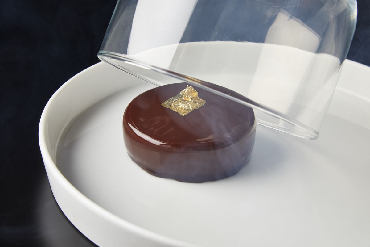 1日20食限定「スモーク・チョコレートケーキ」900円は、カカオ70%のチョコレートをスモーク。まん中のラズベリーコンポートとのバランスが濃厚な味わいです。イートインのみの販売で、目の前でスモークを使用した演出が楽しめます。