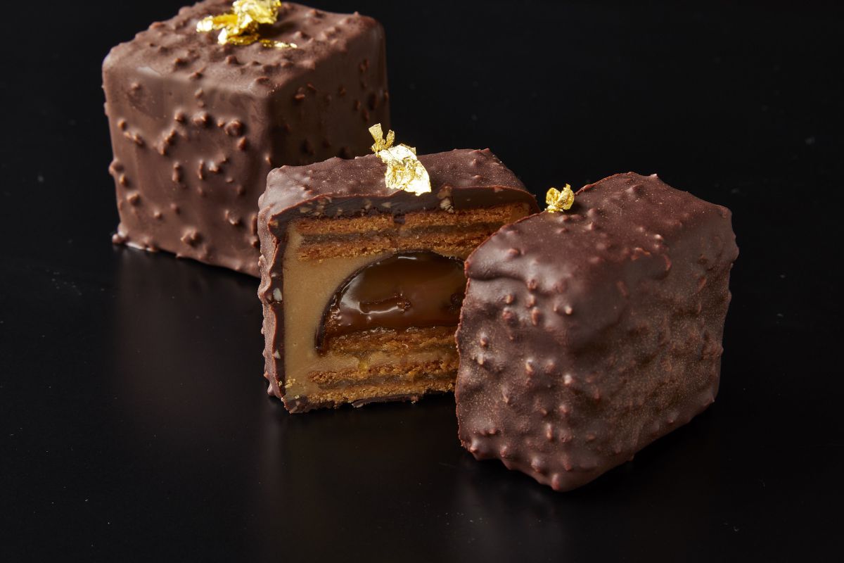 「チョコレート・ロッシェ」2600円は、一口サイズで提供されるフランスで定番のボンボンショコラ。ブラック、ミルク、ホワイトに次ぐ世界初のブロンドチョコレート“ドゥルセ”のガナッシュで、塩味をきかせたヘーゼルナッツプラリネとキャラメルを包み、アーモンドサブレとレモンコンフィでサンドしています。