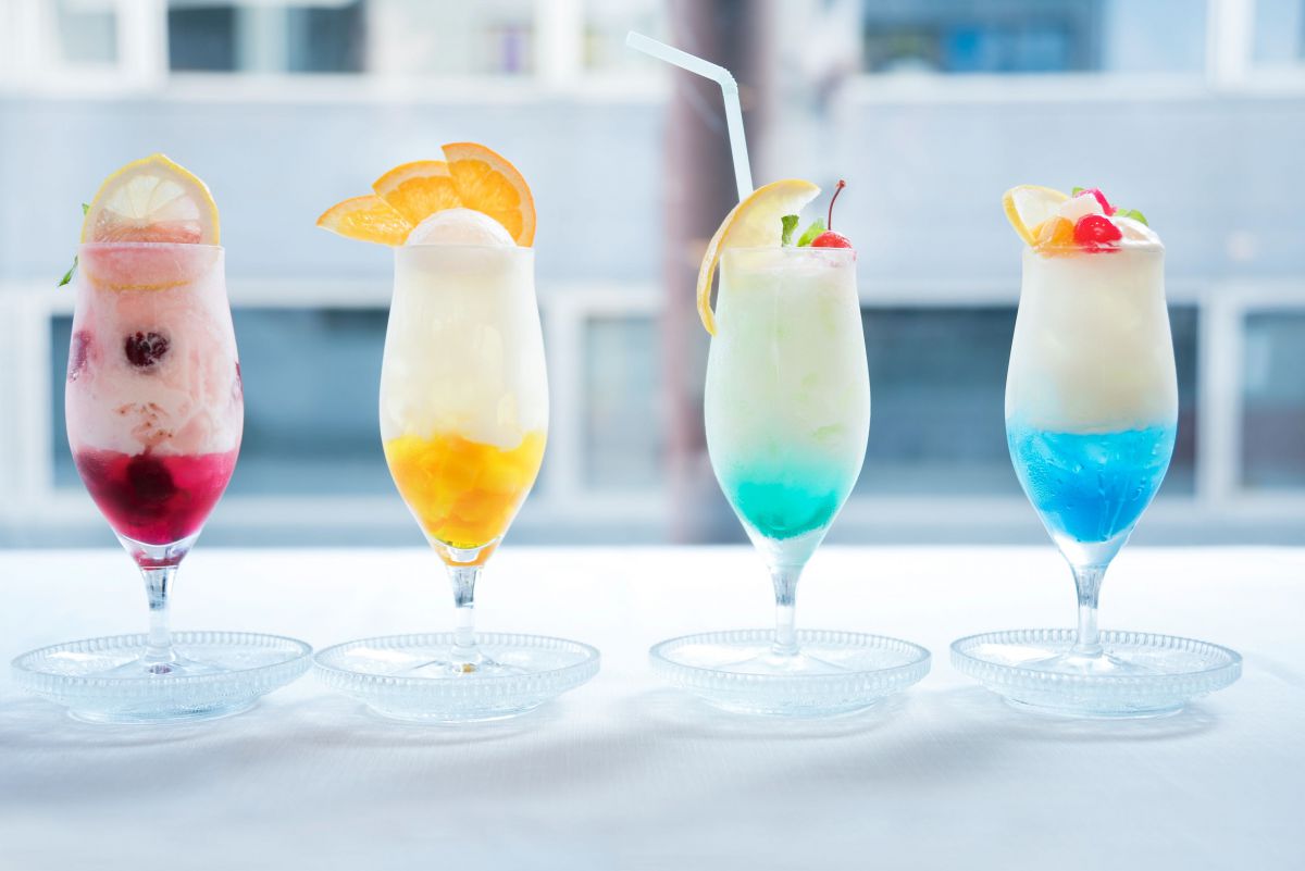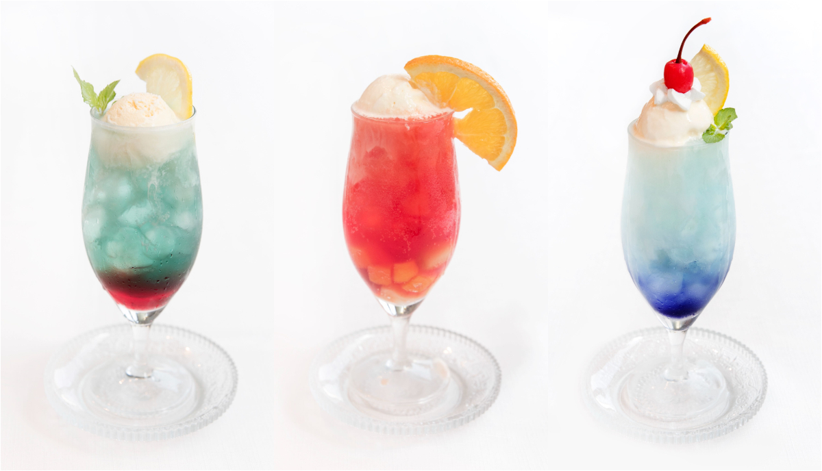 オリエンタルカラーのソーダ、フルーツを底にたっぷりと入れたもの、空と海を表現した夏らしい1杯など、どれもかわいくてフォトジェニック!