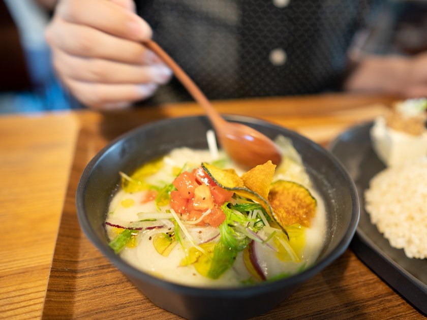 味噌汁のような、スープのような不思議なお味。豆乳のまろやかな味がしつつ、オリーブオイルのコクも効いています。トマトがさっぱりして、とてもよいアクセントに!ヘルシーで野菜がたっぷりなので、野菜好きにはたまらない一品です。