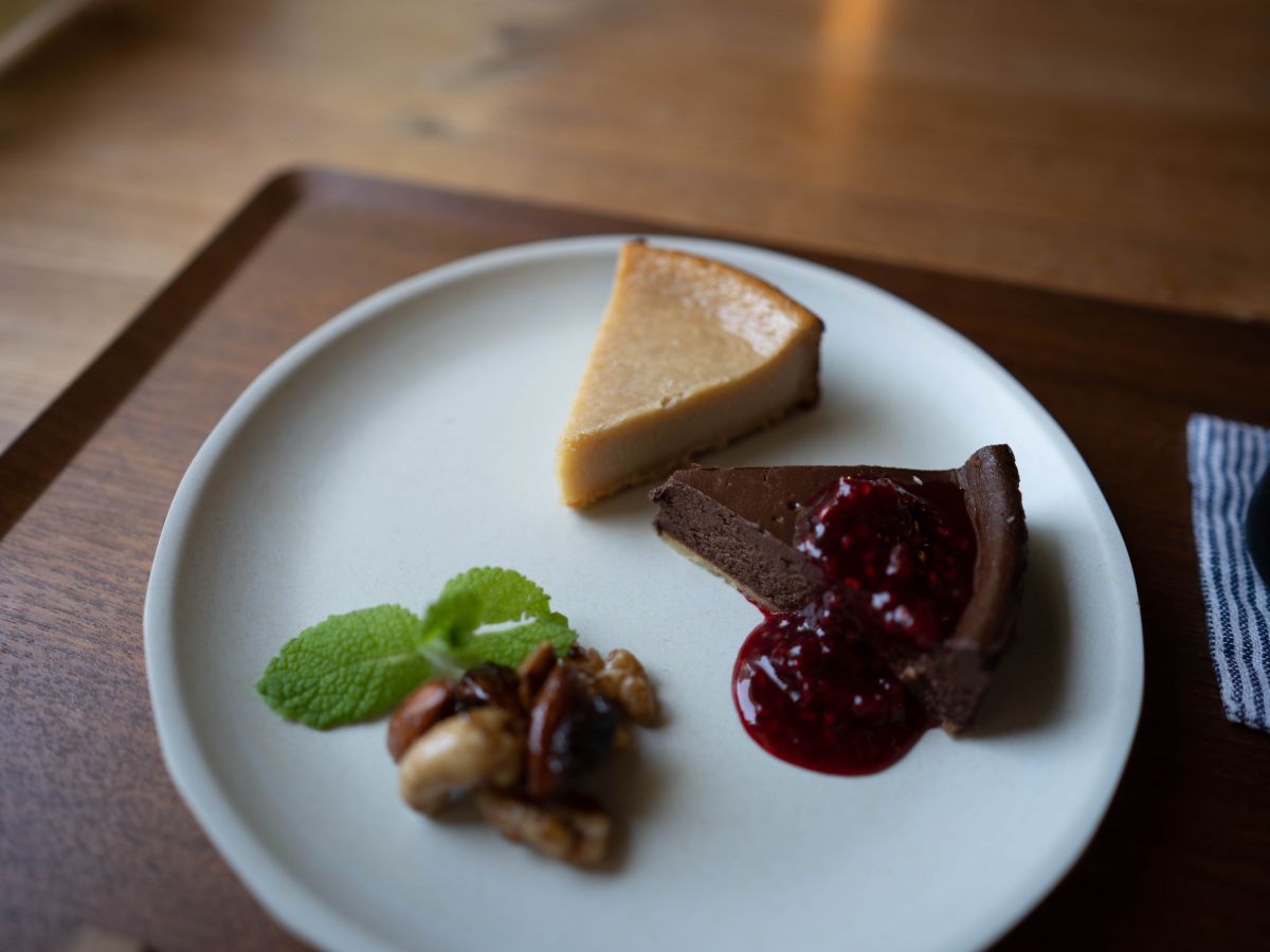 デザートには、2種類のケーキとドリンクがセットになった、お得なケーキセットをいただきます。ケーキのメニューは「チーズケーキ」と「焼チョコタルト」の2種類。季節によってメニューは替わるのだそう。ランチのデザートや単品でも頼むことができますよ!