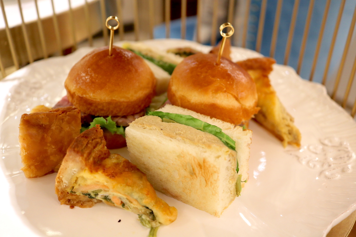 下段にはサンドイッチとバーガー、キッシュ。さらには2種類のスコーンに生クリーム、蜂の巣蜜、バターを添えて。