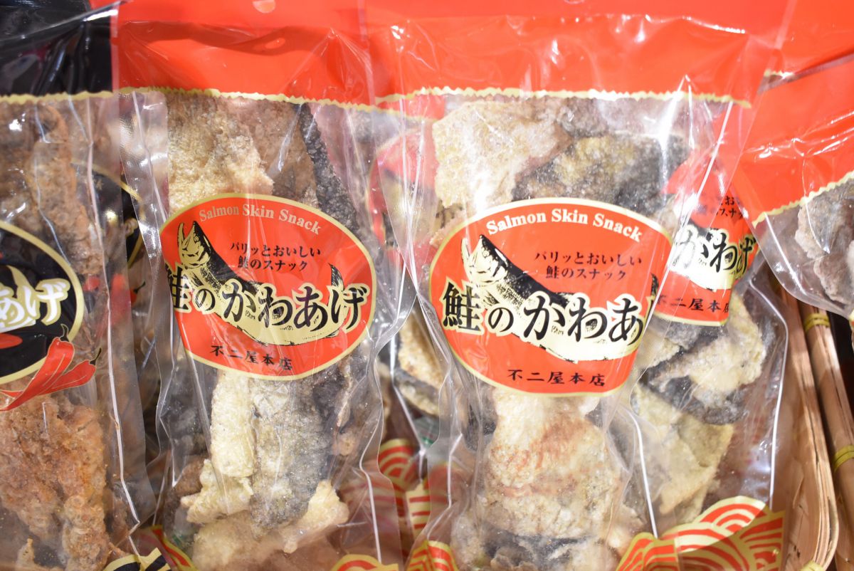 鮭の皮をパリッと揚げたチップス。しお味・ピリ辛・ガーリックの3種類があり、しお味が特に人気なのだそう。