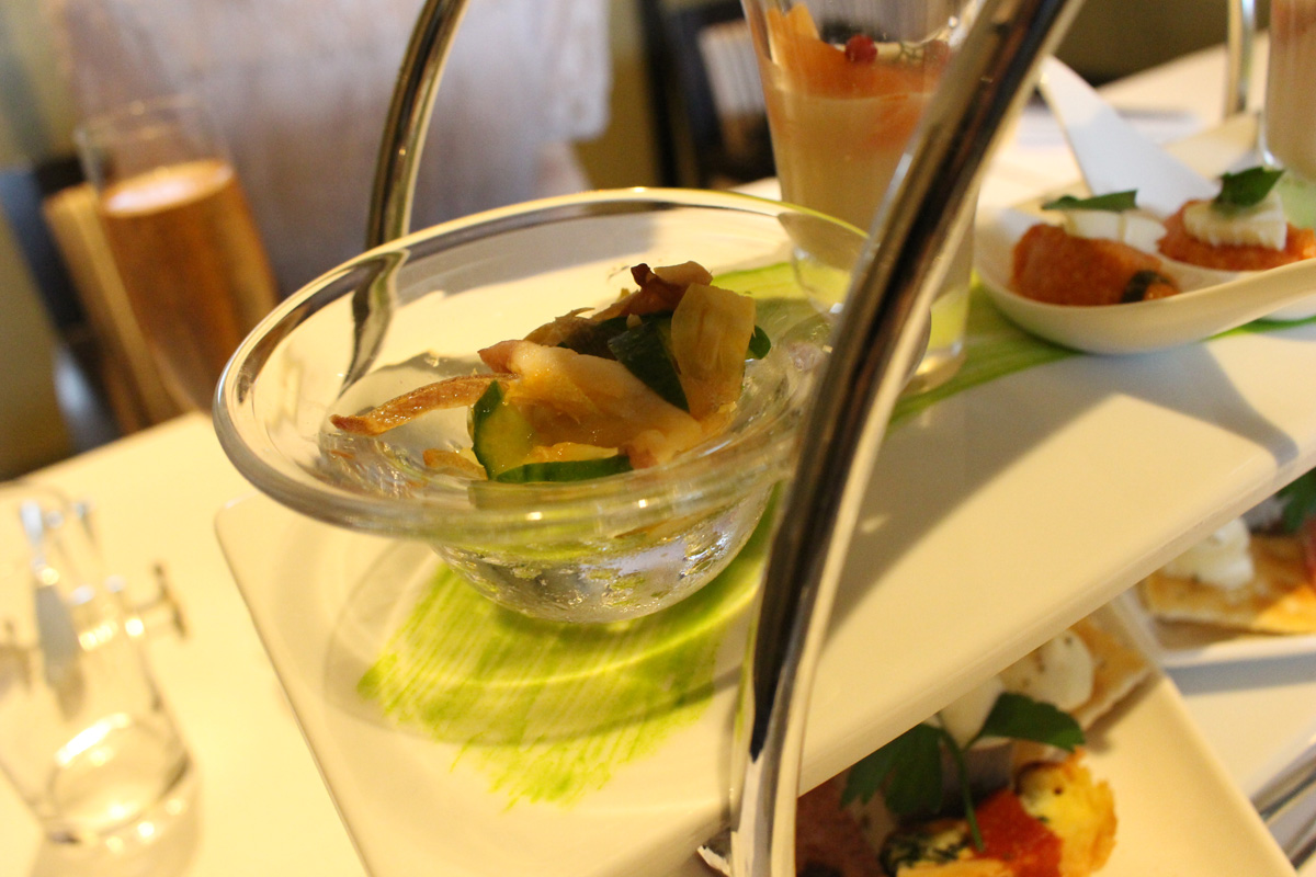 中段にある「魚介類のマリネ」は、お酢のすっぱさを感じさせない、あっさりとした味付けです。みょうがの香りがアクセントになっていて、美肌効果の期待できるタコも入っています。
