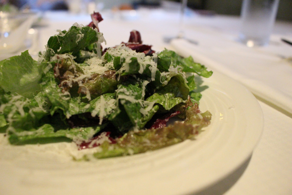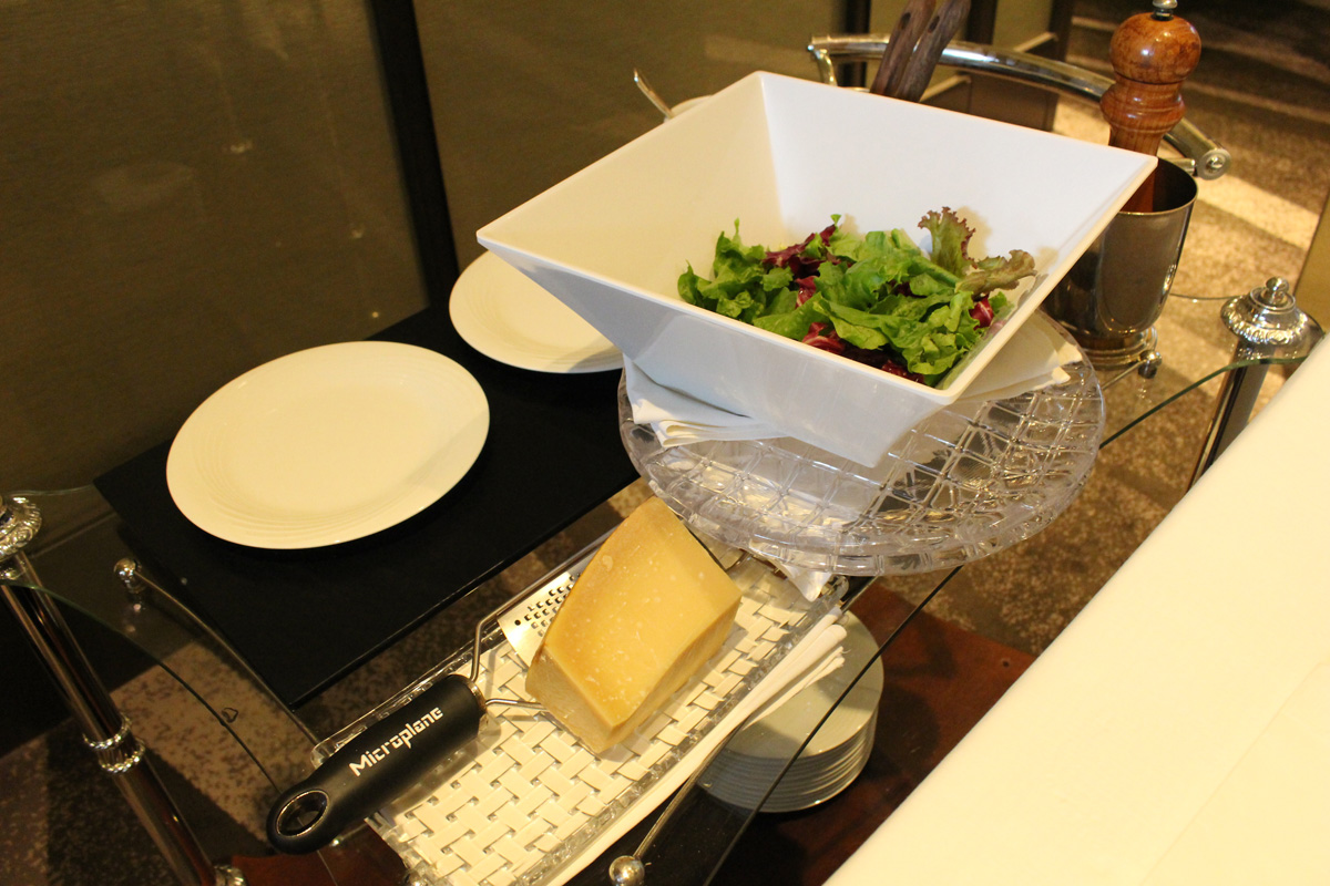 コースで提供される「シーザーサラダ」は席の目の前で作られ、ライブ感を楽しむことができます。 ドレッシングをサラダに和え、パルミジャーノレッジャーノをたっぷりと削って仕上げられます。