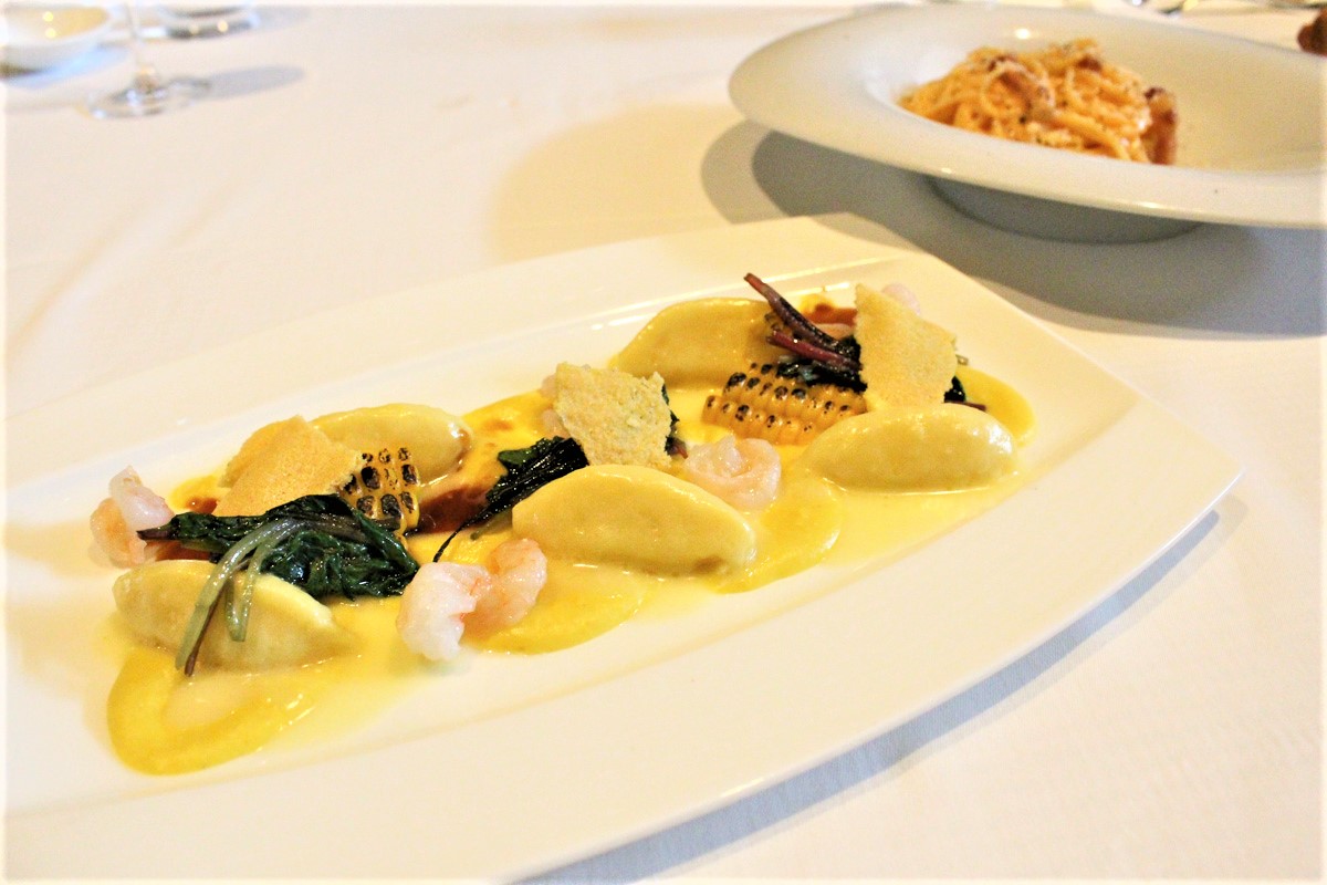 今回は、「とうもろこしのニューディー ポレンタクロカンテと海老ソテー添え」と「千葉県産アスタキレッド卵のローマ風カルボナーラ」をいただきました!