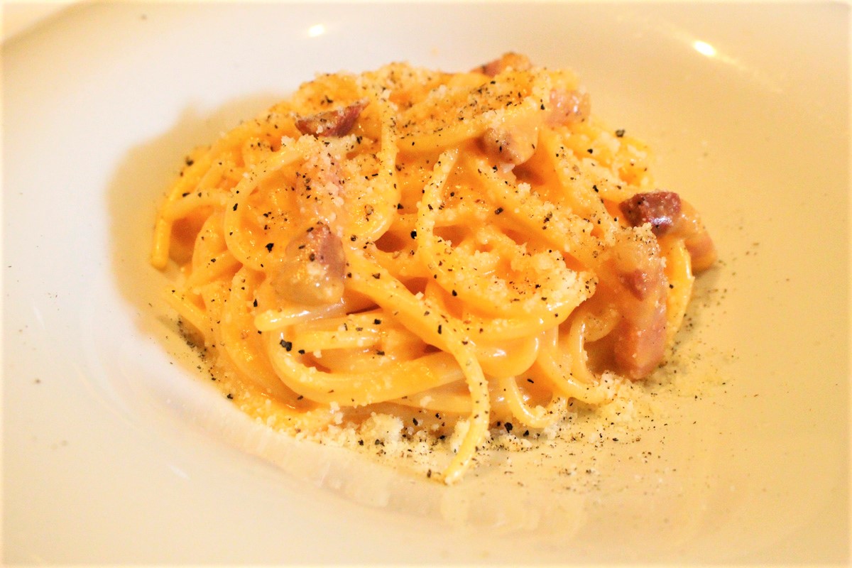 生クリームを使わず、卵とチーズで仕上げるローマ風カルボナーラは、濃厚な口当たりですが食べやすく、太麺との相性も抜群!