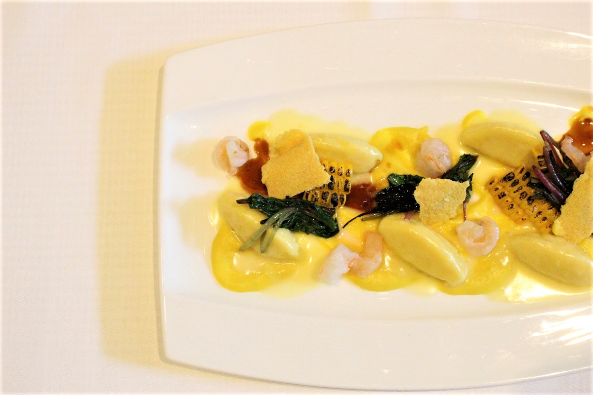 「とうもろこしのニューディー ポレンタクロカンテと海老ソテー添え」は、ニューディーと呼ばれるニョッキのようなモチモチ食感のショートパスタに、とうもろこしの甘味が引き立ったクリーミーなソースと、さっぱりと炒めたほうれん草と海老のソテーが和えられた一品です。