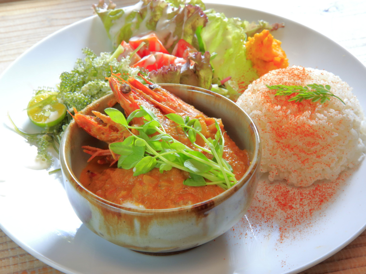 写真は「車えびスパイスカレー」(980円)。実は宮古島では、車エビの養殖が盛んなんですよ。こちらのお店では、魚介に合うスパイスを調合し、エビの旨みを生かす清涼感のある味付けのカレーに仕上げられています。抜群のエビの風味を楽しめますよ!