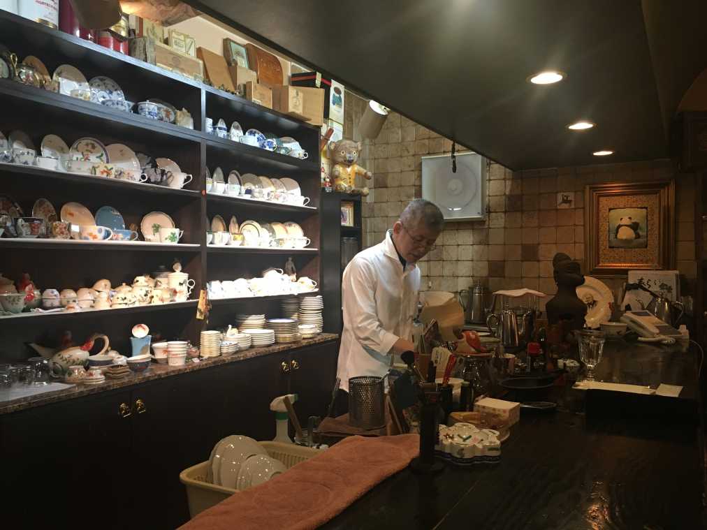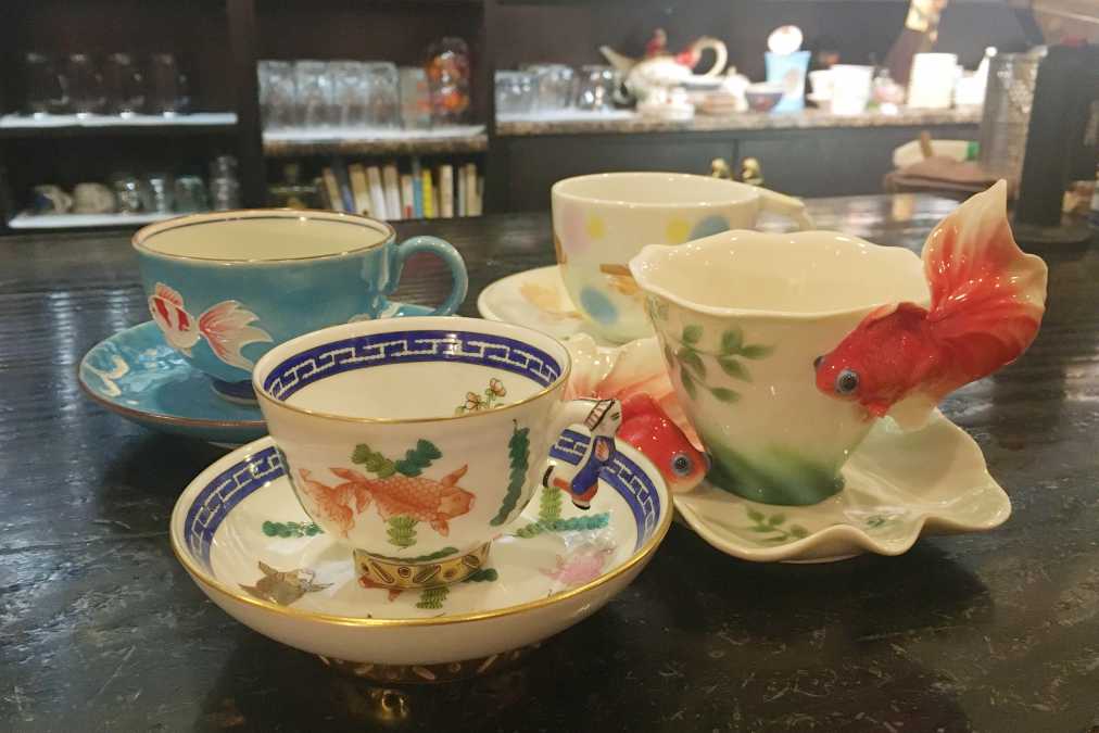 2階のカウンターうしろには、店主こだわりのコーヒーカップ、おちょこ、中国茶カップやお皿がずらりと並びます。金魚モチーフなのはもちろんのこと、どれもマイセン、ノリタケ、伊万里などの高級食器ばかりです。