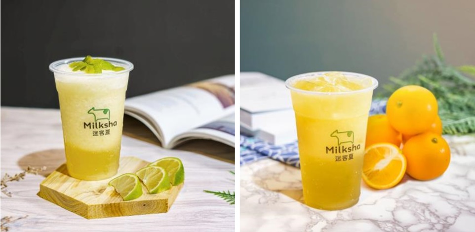 「台湾レモン抹茶フラッペ」600円(左)、「台湾オレンジジャスミン緑茶」550円など、フレッシュフルーツを使ったドリンクもラインナップ。