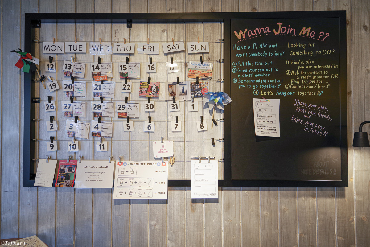 また、たこ焼きパーティーや神楽坂の居酒屋巡りなど、日によって様々なイベントが行われていて、宿泊していなくても参加OK。一階の壁にはこうしてイベントカレンダーがかけられています!国際交流の場としても使えるので、英語を勉強したい方もよく遊びに来るのだとか。