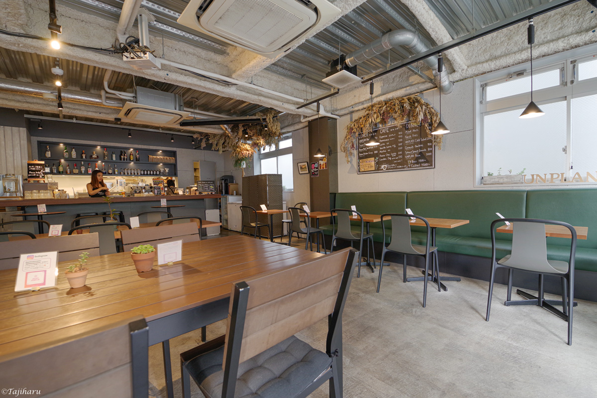 一階のカフェ「Gather by UNPLAN」。天井から下がるランプやドライフラワー、観葉植物がお洒落で、まるで海外のカフェに来たみたい。月曜から土曜日の10時30分〜23時、日曜日は19時まで、宿泊者以外も利用できます。