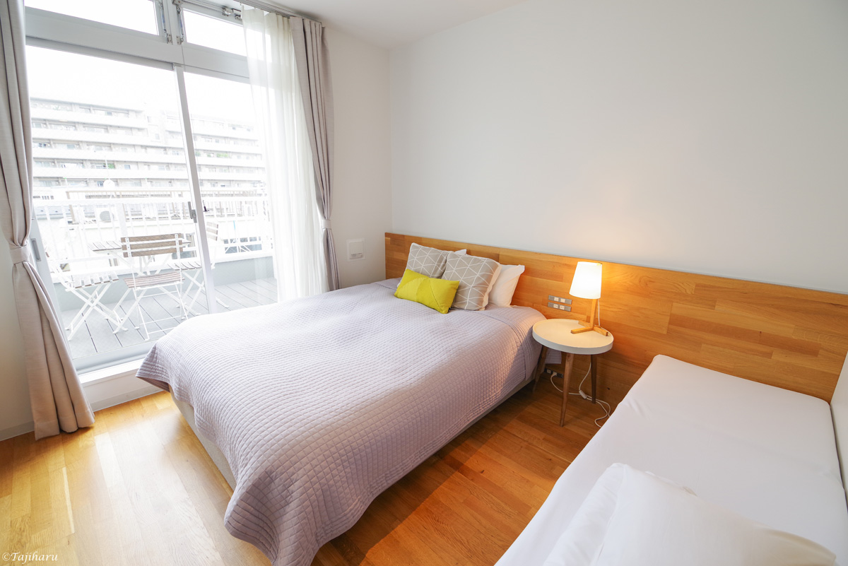 UNPLAN Kagurazakaはドミトリーだけでなく個室もあり、プライベートダブルルームはダブルベッド1台とソファーベッド1台を完備した個室。最大3名まで宿泊可能です。部屋からはテラスに出られるようになっています。
