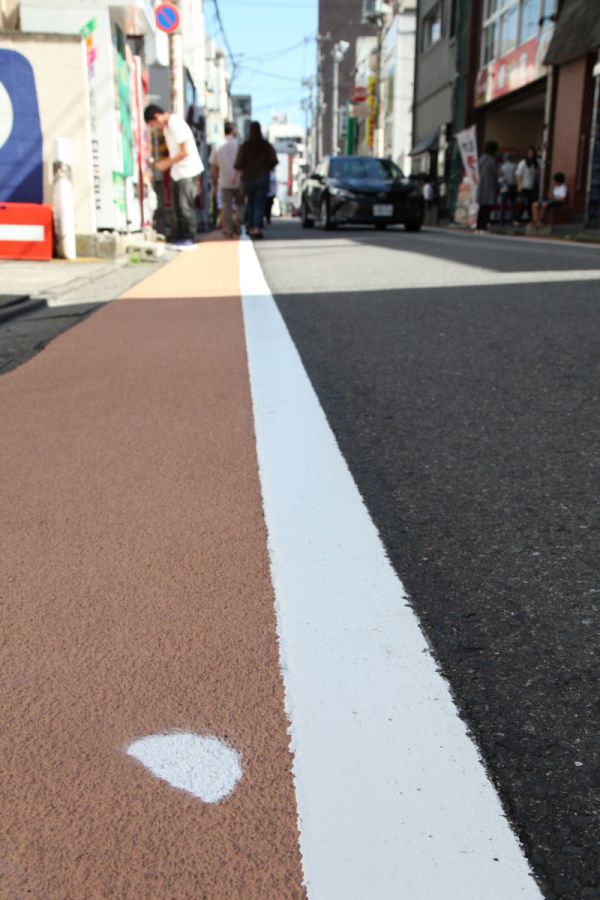 全長約160mの通りには、電柱看板やバス停など至るところに餃子のモチーフが散りばめられ、歩道部分も餃子の焼き色カラーに!