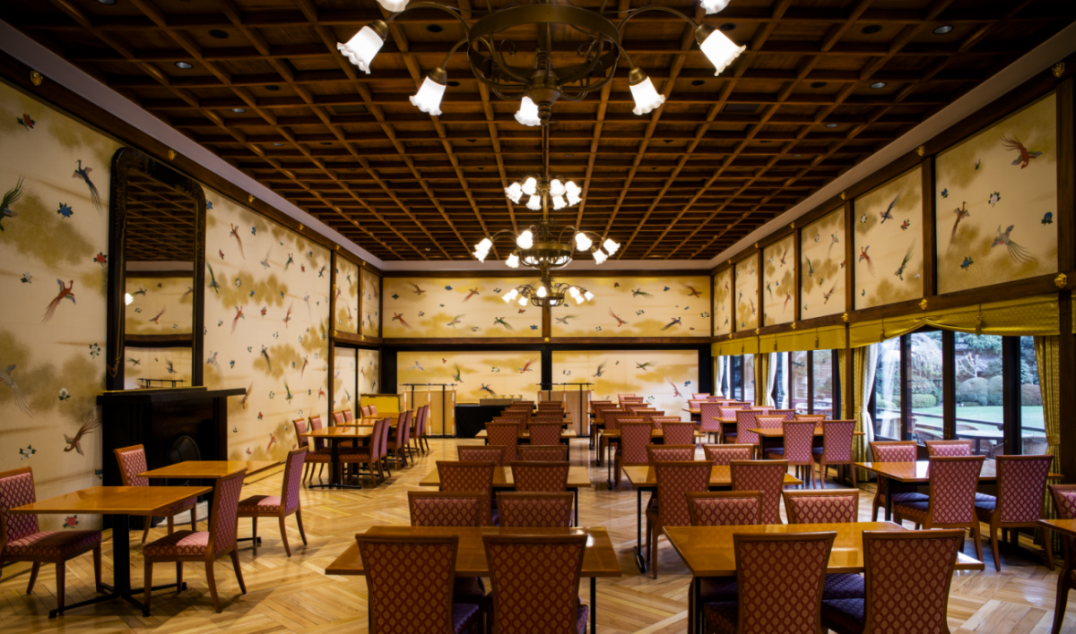 国賓を迎えての公式晩餐会の会場となるのが、このシックな「花鳥の間」。 天井には36枚の天井画、壁面には30枚の七宝が飾られ、それぞれに花と鳥が描かれています。