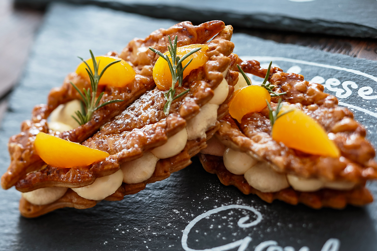 「キャラメルとゴーダチーズのミルフィーユ」は、キャラメルが香るコク深いチーズバタークリームを、サクサクのパイ生地で挟んだ食感も楽しい一品。それぞれのチーズが持つ個性を味わいましょう。