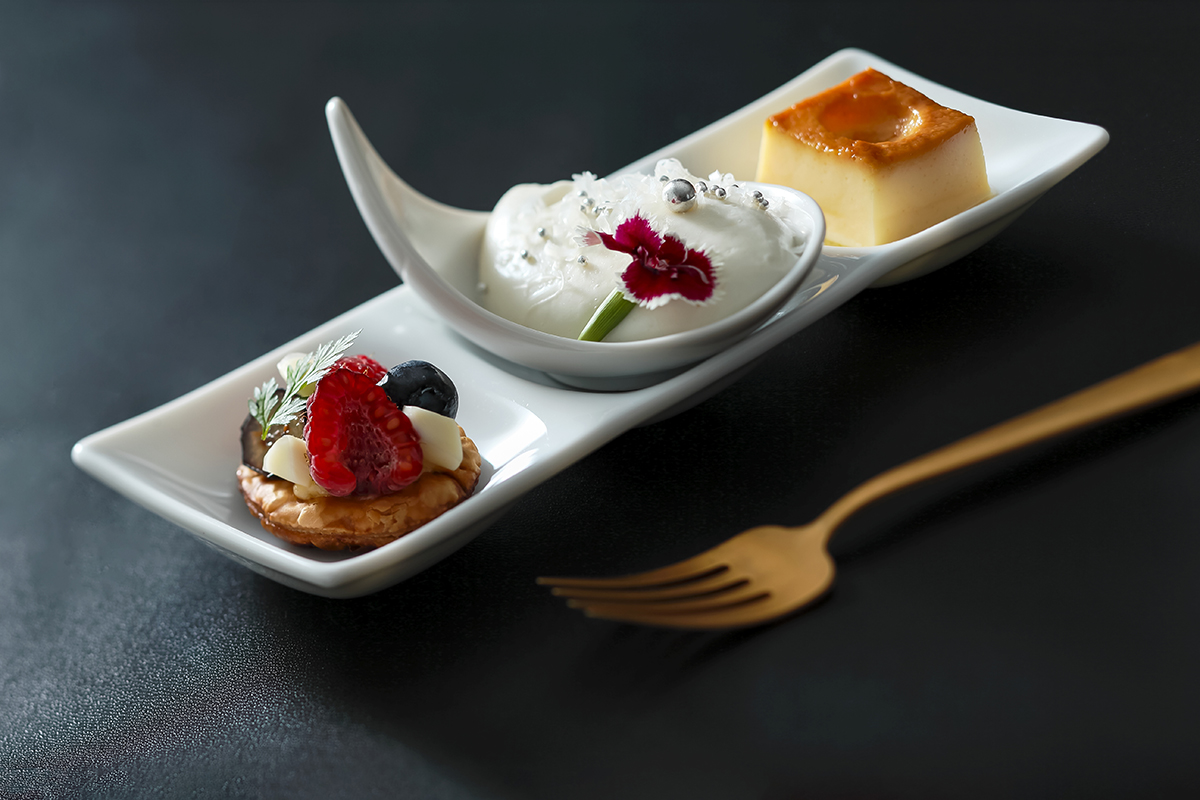 やさしいプリンにチーズのコクを加えた「美山ゴーダチーズのプリンキューブ」、爽やかなヨーグルトにゴーダチーズの塩味がアクセントの「美山ヨーグルトムース」、香ばしいパイ生地にフレッシュモッツァレラとアーモンドクリームを乗せた「美山モッツァレラのプティフール」。素材の良さが口にした瞬間に感じられるおもてなしの1皿に大満足。