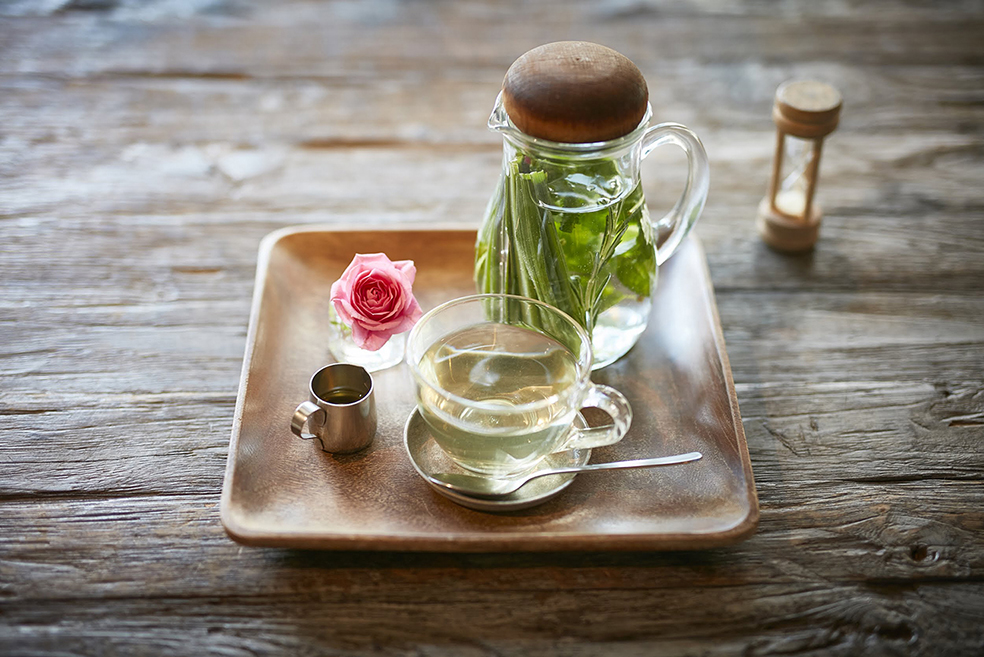 ハーブティーを豊富にとりそろえているのが、「青山フラワーマーケットTEA HOUSE」の特徴の一つ。写真は、5種のフレッシュハーブをブレンドして仕上げた、「フレッシュハーブティー」(750円+税)。