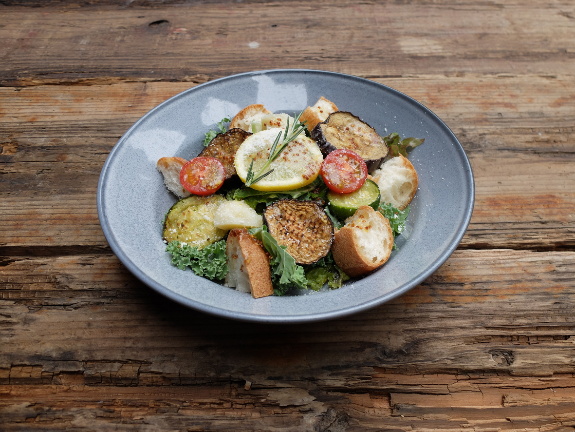 また、サラダをはじめ、野菜をたっぷりと摂れるメニューも。写真は、菜園風サラダ(1200円+税)。旬の野菜が多用された、食べ応えのある一品です。