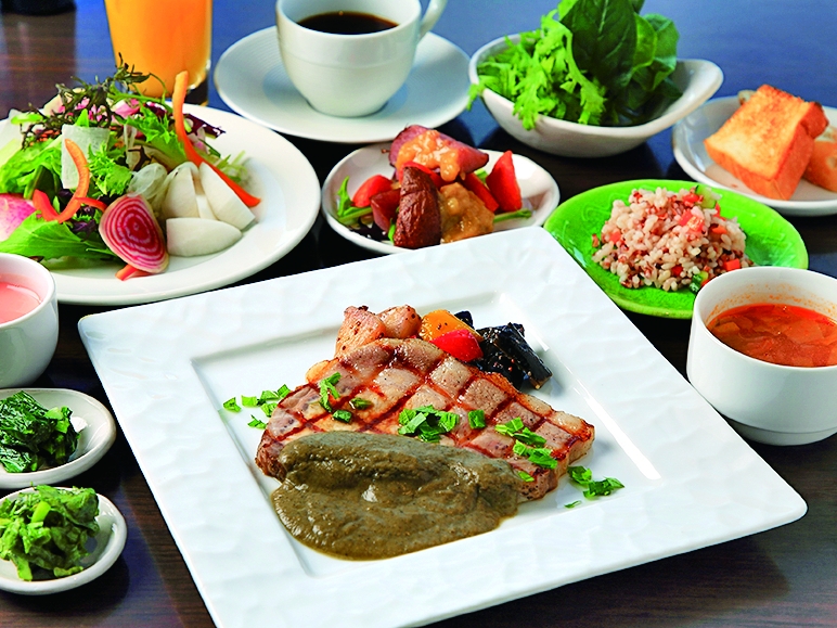養命酒製造がプロデュースした、安全でやわらかくおいしい信州十四豚が味わえるレストラン。ランチはメイン4種類から選び、旬の新鮮な野菜ビュッフェが人気です。諏訪湖の絶景とともに信州食材の魅力を存分に堪能できます。写真は床から天井まで全面ガラス窓が特徴です。窓際の席で、諏訪湖を眺めながら信州食材を使った料理を満喫してください。