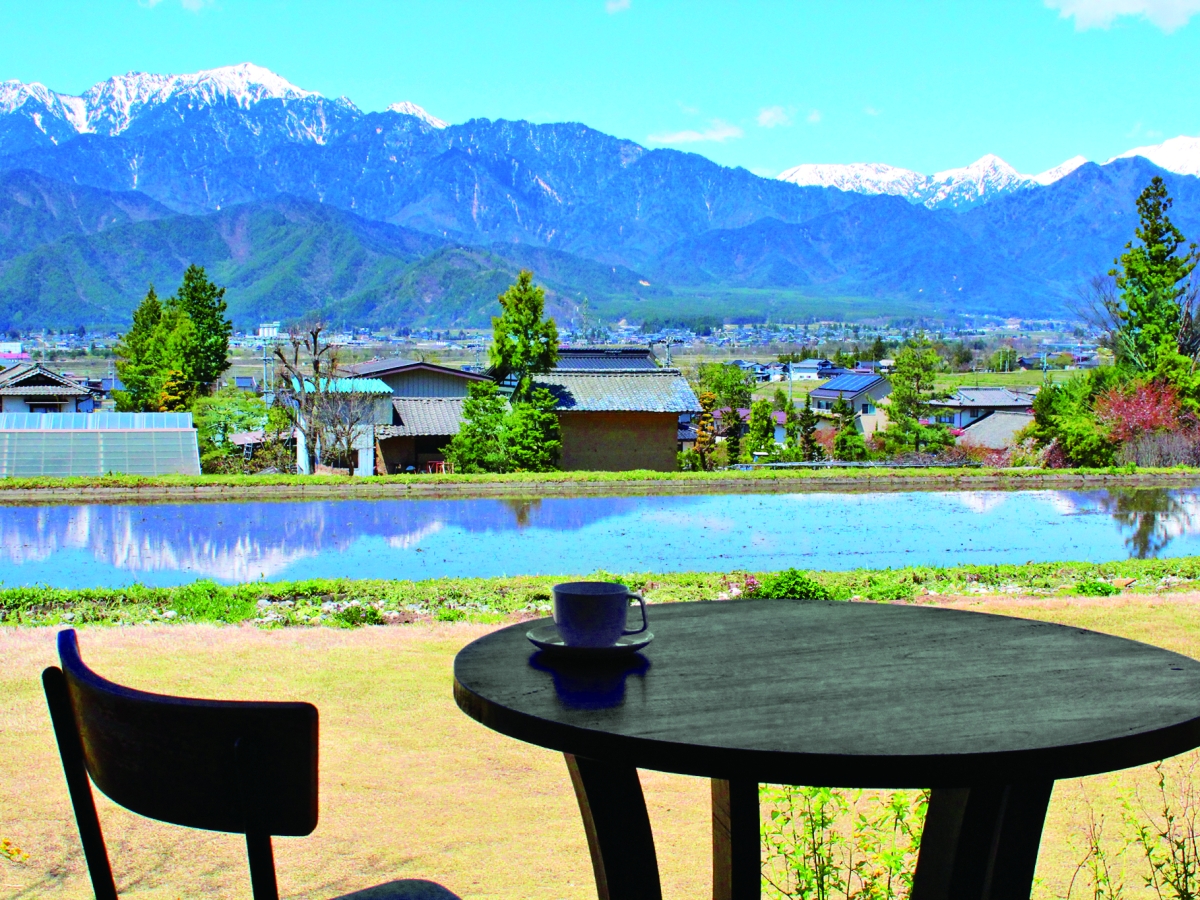 悠然とそびえる北アルプスの山の稜線を眺めながら、田園の風に吹かれてゆったりとティータイムを過ごせる一軒家カフェ。自家焙煎のコーヒーと一緒に自家製パンやケーキを味わいましょう。写真は田園風景と北アルプスを一望できるテラス席。予約すれば望遠鏡で山の眺めを楽しめます。