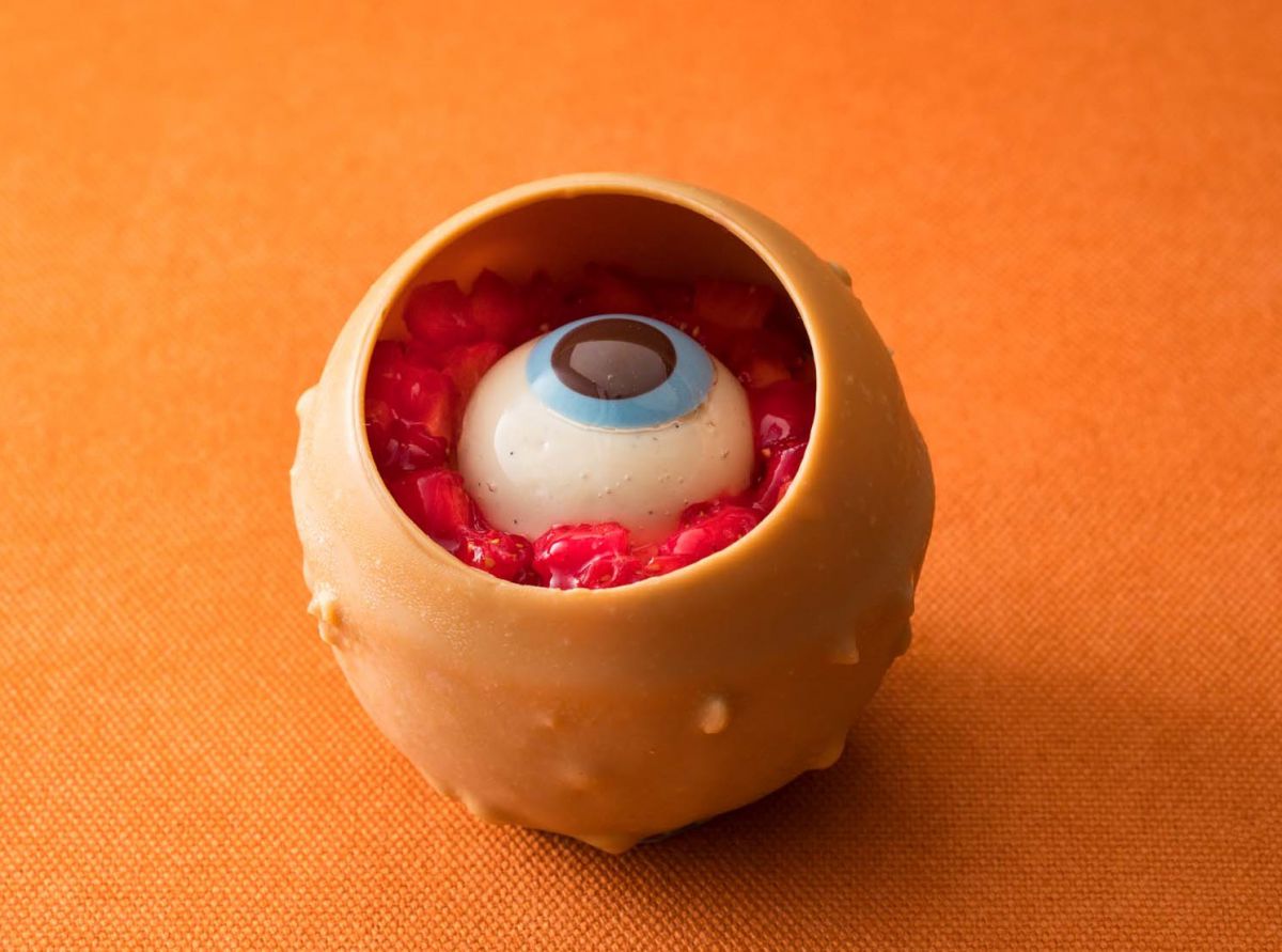 「イービルアイ」650円は、ギョロっとした目のモチーフがリアルなムースケーキ。ビスケットやキャラメルのような香ばしさと、ほのかな塩気が魅力のフランス産ブロンドチョコレートをたっぷりと使用しています。