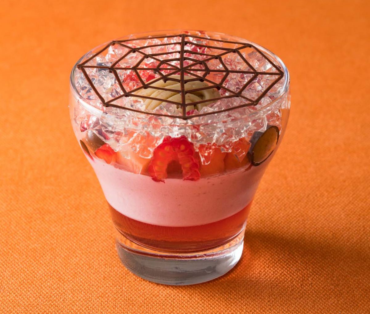 苺とカシスのピューレを合わせたプリンと、カシスリキュールで香りづけしたゼリーを2層にしたグラスデザート「スパイダーネット」650円。真ん中のモンブランクリーム、甘酸っぱいカシスとほっくり甘い栗が絶妙なバランスです。