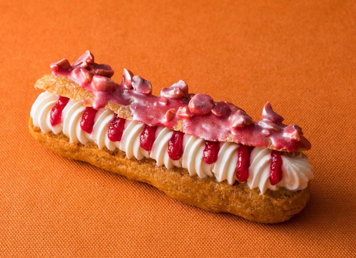 モンスターの大きな口を思わせるエクレア「ミミック」650円。上品な甘さの生クリームと、メイプルクリームを合わせた秋にぴったりの濃厚なクリームをたっぷりサンド。ホクホクした食感の栗のコンポートと、バラの風味をつけた爽やかな酸味のフランボワーズのジャムがベストマッチです。
