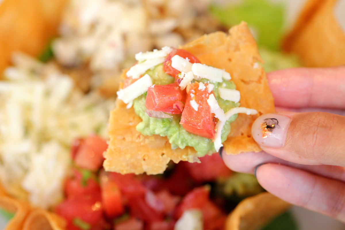 トスターダは、器そのものが食べられるトルティーヤ。具材は、ワカモレ、チキン、サルサなどがぎっしり!