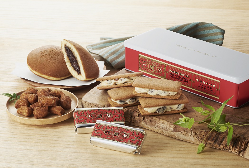 「六花亭」も出店!「マルセイバターサンド缶(1缶12個入り)」1800円や「極楽(かりんとう)」159円、(左手前)「どらやき」140円(左奥)の3品は1週目限定販売なのでお見逃しなく。