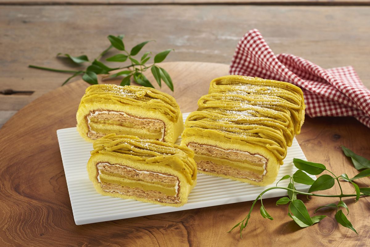 函館市「五島軒」の「栗かぼちゃのミルフェ」1296円は、サクサクのミルフィーユをスポンジで包み込んだ“ふわサク”の新食感が楽しいスイーツ。栗かぼちゃを使ったペーストをパイ生地にはさみ、上にもたっぷり絞った絶品スイーツです!