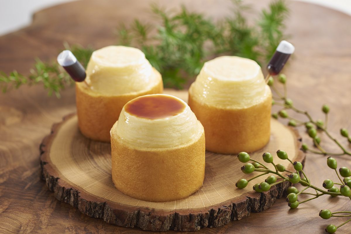 小樽市「円甘味」の「プリンONバウム」1個450円は、しっとりやわらかいバウムクーヘンにたっぷりのカスタードクリームを入れ、その上にプリンをのせたスイーツ。別添えのカラメルソースをかけて召し上がれ。各日限定100個の販売。
