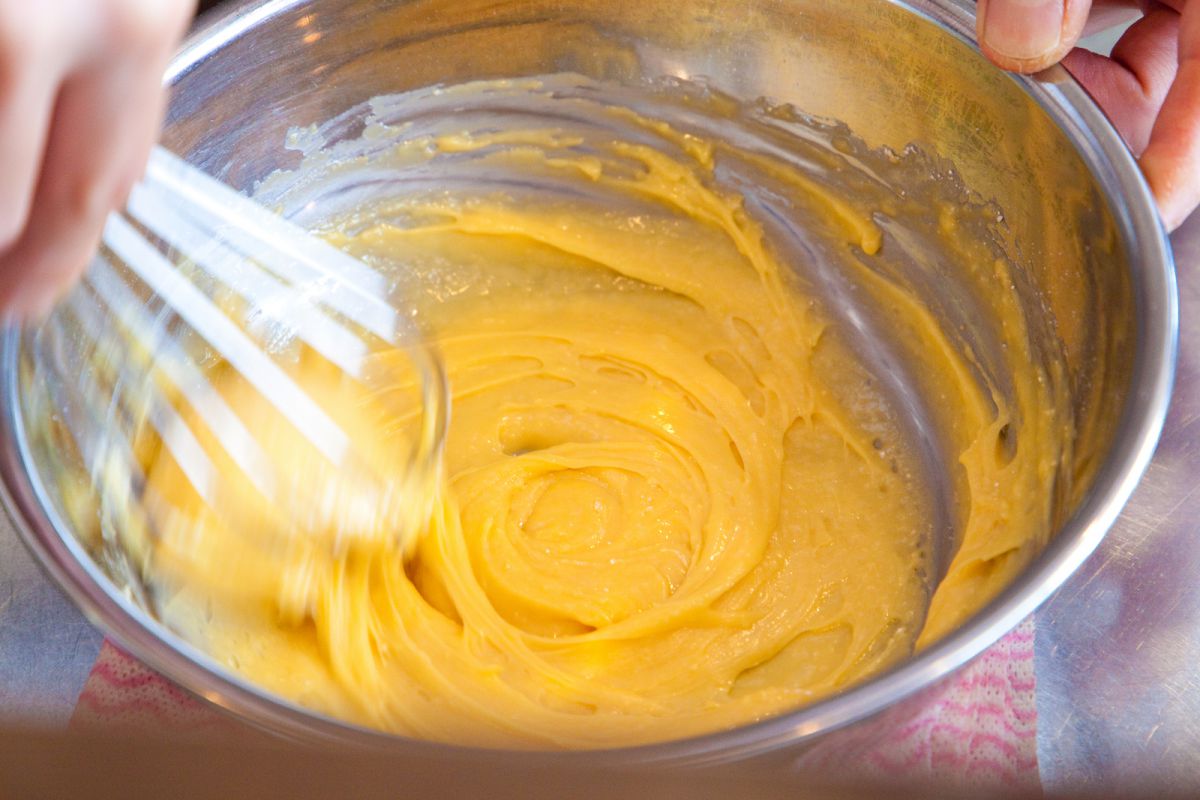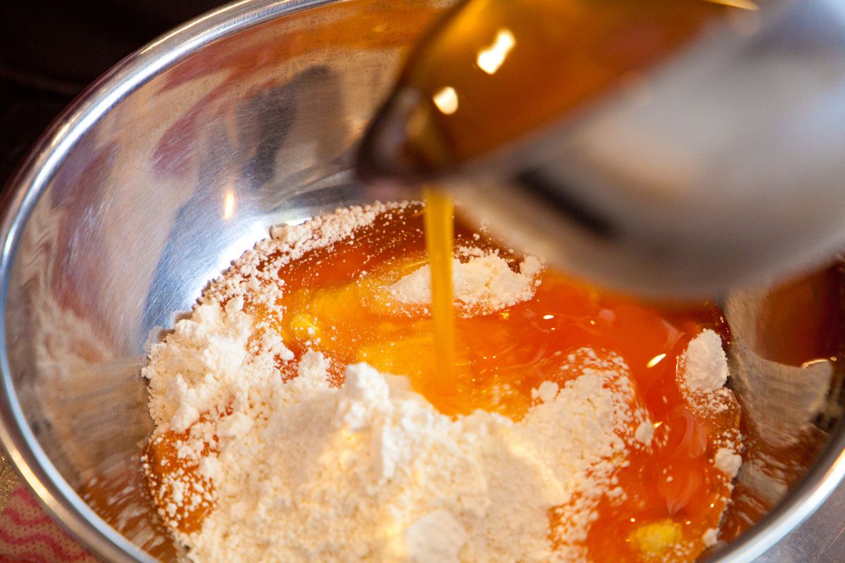 割り入れた玉子は大原野(京都盆地の山の麓)の養鶏場まで生みたてを仕入れています。シンプルなお菓子だからこそ、素材がとっても大事なのです。