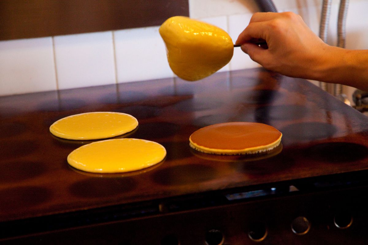 イートインできる作りたてのどらやきは、“作りたて”を味わってほしいと、よほど混雑していない限り、粉をボウルに入れて生地を混ぜるところから作り始めます。