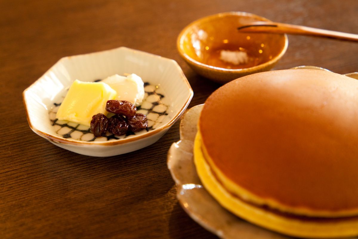 イートインには、焼きたてのどら焼きに3つのトッピング(チーズ、バター、ラムレーズン)と淡路島の『五色の浜雫』の釜炊き塩が付いてきます。 3つのトッピングは皮をめくって、あんこの上にのせて食べるのが大塚さんのオススメ。