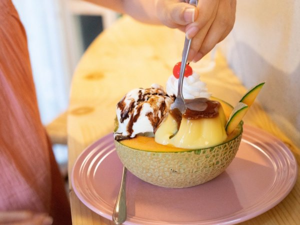 メロンだけでも十分贅沢なのに、それに加えて、プリンや生クリーム、さくらんぼもアイスクリームもチョコレートソースものっています。それぞれをメロンと一緒にいただいたり、全部一緒に食べたりとたくさんの楽しみ方が。最後の果汁まで飽きることなく、メロンのうま味を堪能できる最高のパフェ。10月いっぱいを目安に市場からメロンがなくなるそうなので、逃したくない方はお早めに!日頃頑張っている自分へのご褒美にぜひ召し上がれ!