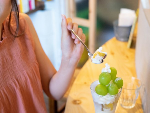 こちらは8月末から始まった季節のパフェ。横から覗いた時の、パフェの綺麗な層にうっとり。いちばん上には、広島・三次産のシャインマスカットがたくさん。皮ごといただけて、一粒頬張るとさわやかな甘みが口いっぱいに広がります。