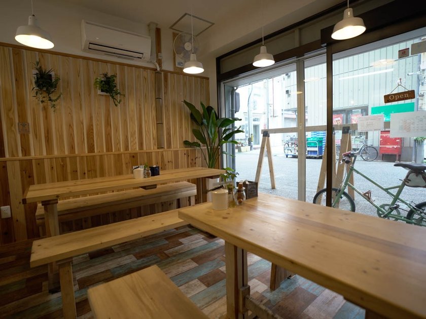 店内はウッドテイストでナチュラルな雰囲気。ガラス張りの窓がとっても開放的です。壁や机やいすなど、店内にはしましま模様がたくさんあってかわいい!