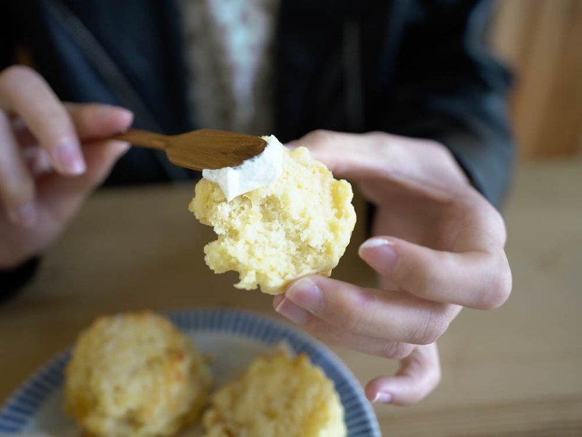 スコーンの味は季節によってさまざま。プレーンスコーンのときには「クロテッドクリーム」と「ジャム」がついてきます。クロテッドクリームは、イギリスでは昔から使われているクリーム。ジャムと一緒に楽しんでみて!