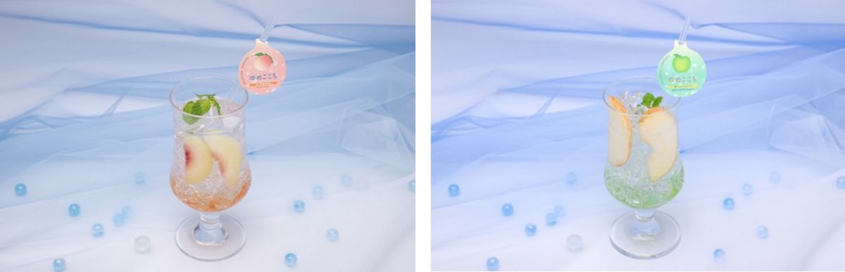 「あの日の晴天」(左)は、グレープフルーツとブルーキュラソーが甘酸っぱく爽やかで晴れ渡った空の爽快さを感じさせてくれるドリンク。「あの日の夕焼け」(右)は、甘酸っぱいクランベリーとオレンジのジュースが相性ぴったりのテイストです。