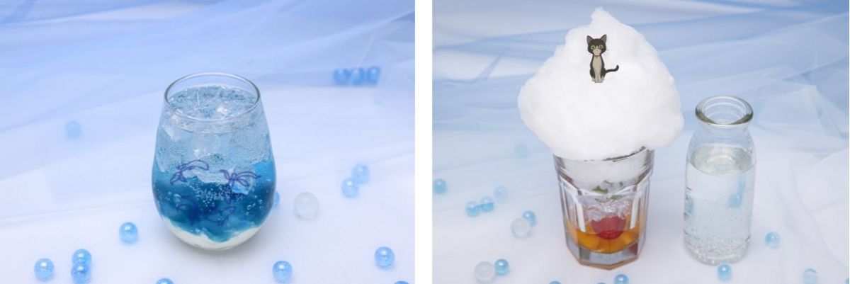 「空のサカナソーダ」(左)990円は、雲を表現したパンナコッタとゼリーで不思議なサカナの泳ぐ空を表現したソーダ。都会に出てきた帆高が路地裏で出会った小さな猫“アメ”を表現したフルーツソーダ「アメの成長ドリンク」(右)1090円。ソーダをわたがしにかけると…。注文してからのお楽しみ!