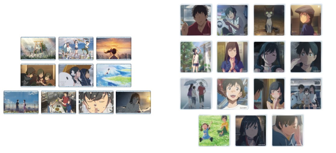「マットスクエア缶バッジ(ランダム10種)」(左)や「アクリルマグネット(ランダム15種)」(右)各500円。映画の感動を思い出すシーンがいっぱい。