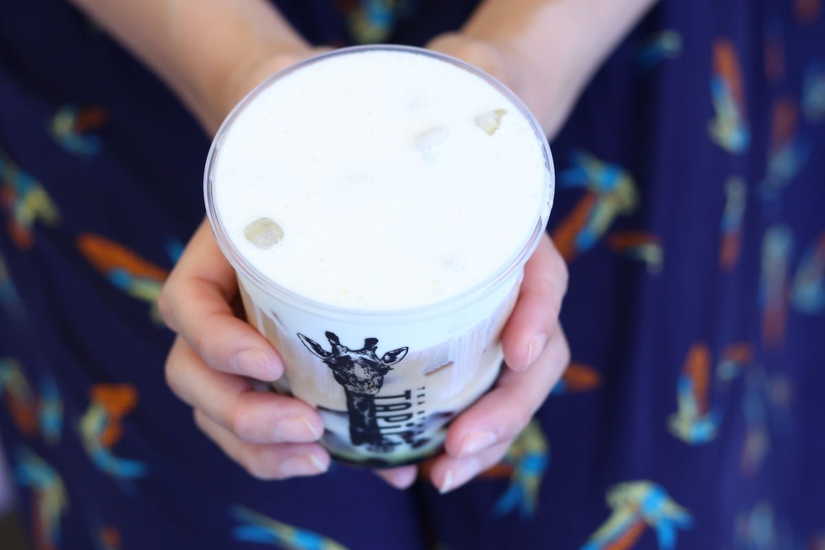 「DEGLABソフトクリーム研究所」のお隣は、タピオカチーズティーのドリンクスタンド「TAPICI」。台湾製造の生タピオカを使用し、もちもちになるよう絶妙な火入れで炊き上げ、温かい状態でカップへ入れます。 看板メニューの「アッサムジラフティー」にはこのタピオカに加え、アッサムティーで仕立てた自家製ゼリーとシロップを重ね、香り高いアッサムティーにチーズミルクフォームでフタをした魅惑のドリンクです。