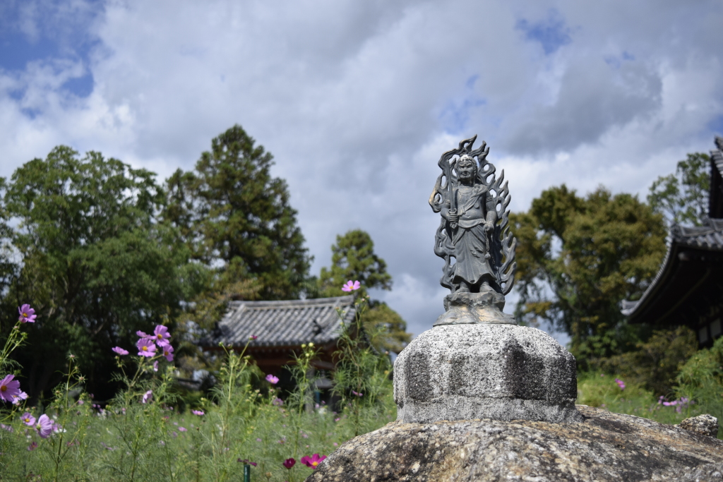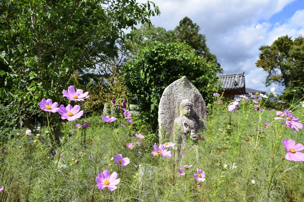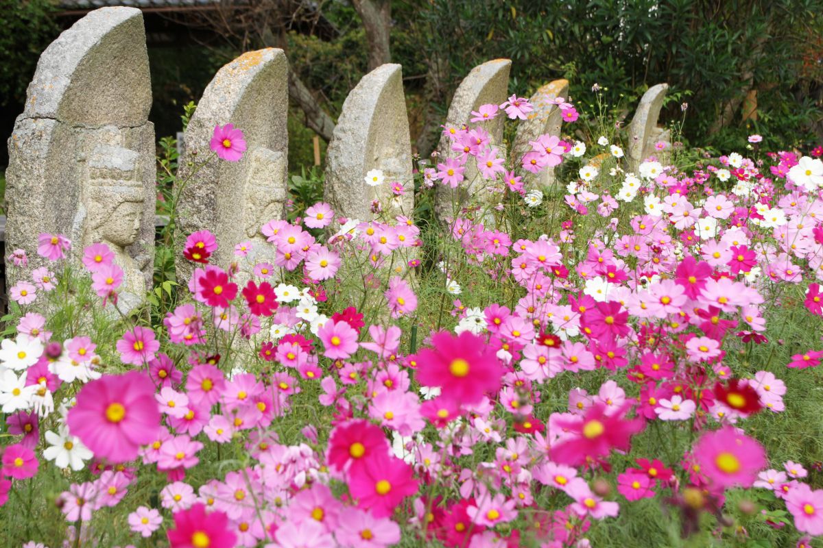 コスモスに囲まれた観音様や阿弥陀様。やさしいお顔がますます和やかに見えますね。堂宇の横や裏にもコスモスが植えられていて、コスモスの間に小さなお地蔵様を見つけることも。