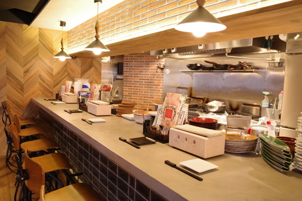 店内はオープンキッチンをコの字に囲むカウンター席がメイン。大判の木製で作られたカウンターは奥行きが広く、ゆったり落ち着けるようさりげなく気配りされています。