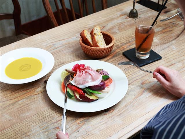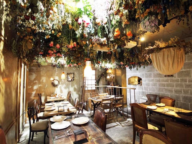 一歩店内に足を踏み入れると、目に飛び込んでくるのが、天井を埋め尽くす花花花。石造りの壁にアンティークの家具というクラシックな店内は、さまざまな花のドライフラワーが天井から吊されていて、まるで花畑にいるような雰囲気です。ランチは、15種類以上の野菜を使ったプレートがメイン。盛り付けがフォトジェニックで、たっぷりの野菜と合わせて、目とお腹どちらも満たされます。ちょっとステキなランチタイムを過ごしたいときにピッタリのレストランです。
