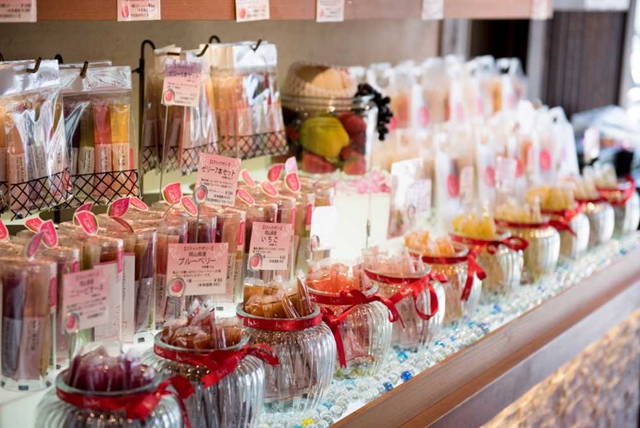 岡山は1年中さまざまなフルーツが楽しめるフルーツ王国。「くらしき桃子」では、冬~春はイチゴ、初春はデコポンなどの柑橘、夏は桃やマンゴー、秋はブドウなど、岡山の旬のフルーツを使ったパフェやアフタヌーンティーをいただけます。フルーツそのものを丸かじりするような、ボリュームたっぷりのパフェは贅沢の極み。ひと口、ひと口に感動しっぱなしです。プリンやジュレなども充実しているので、おみやげにもおすすめです。