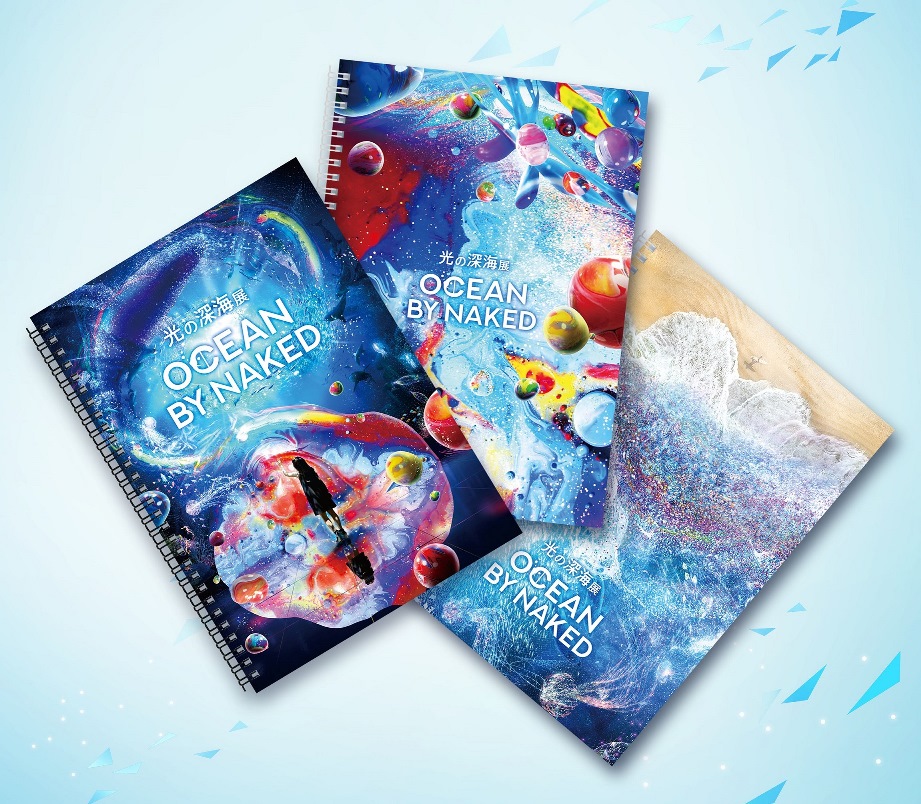 会場内の物販コーナーでは、ここでしか買えない『OCEAN BY NAKED』オリジナルグッズ(全12種類)が登場。ビビットなカラーで『OCEAN BY NAKED』の世界が描かれた「オリジナルノート3種」各800円。