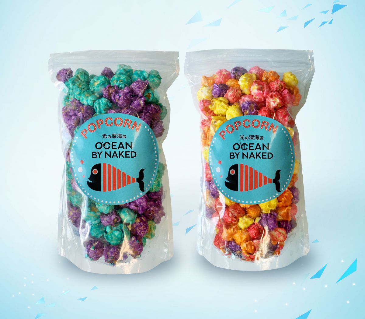 オリジナルグッズにはおみやげにピッタリのスイーツもあります。カラフルな「ポップコーン2種」は各800円。